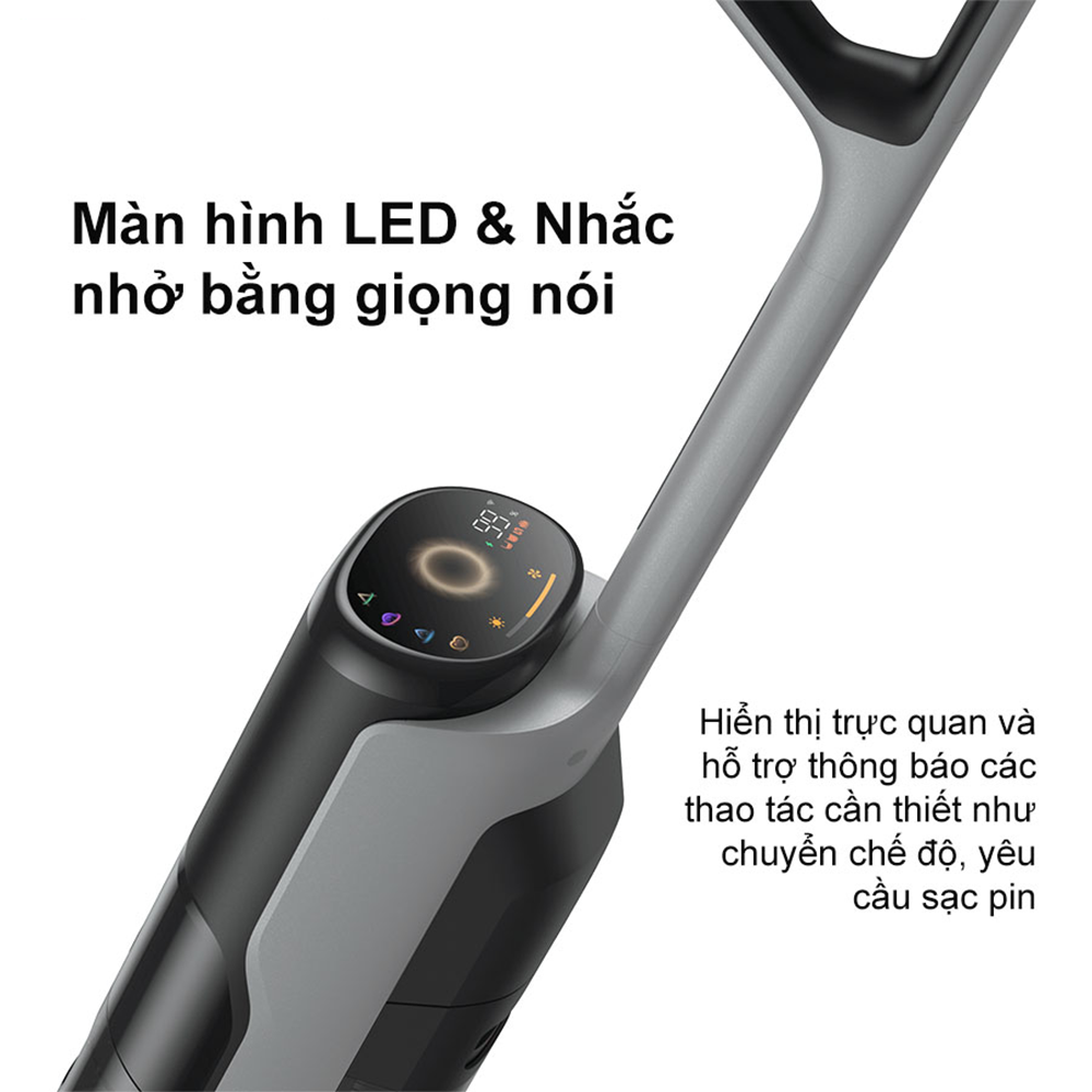 Nhờ giao diện trực quan, người dùng có thể nhanh chóng nắm bắt tình trạng hoạt động của máy chỉ bằng một ánh nhìn. Bên cạnh đó, tính năng nhắc nhở bằng giọng nói được tích hợp thông minh, hỗ trợ thông báo các thao tác cần thiết như chuyển chế độ, yêu cầu sạc pin, vệ sinh bộ lọc hoặc thay phụ kiện. Điều này giúp quá trình vận hành trở nên dễ dàng, hạn chế tối đa việc phải kiểm tra thủ công và mang lại trải nghiệm sử dụng thoải mái, hiện đại hơn cho người dùng.