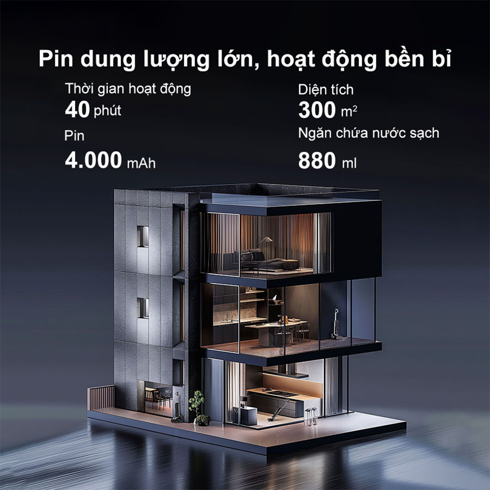 Dreame H14 Station được trang bị viên pin dung lượng 4000mAh, cho thời gian sử dụng liên tục lên tới 40 phút chỉ với một lần sạc đầy. Nhờ vậy, bạn hoàn toàn có thể dọn dẹp toàn bộ căn hộ hoặc nhiều phòng liền mạch mà không lo gián đoạn, đảm bảo công việc vệ sinh được thực hiện nhanh chóng và hiệu quả.