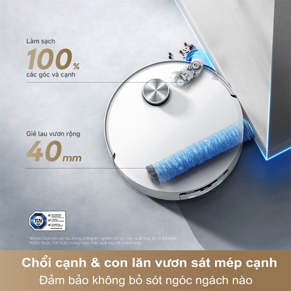 Với công nghệ MopExtend™, con lăn lau có thể mở rộng tới 40mm, giúp robot xử lý hiệu quả bụi bẩn dọc tường và các góc cạnh gồ ghề. Tính năng này mang lại trải nghiệm làm sạch sâu hơn, đặc biệt tại những khu vực mà robot thông thường khó tiếp cận.