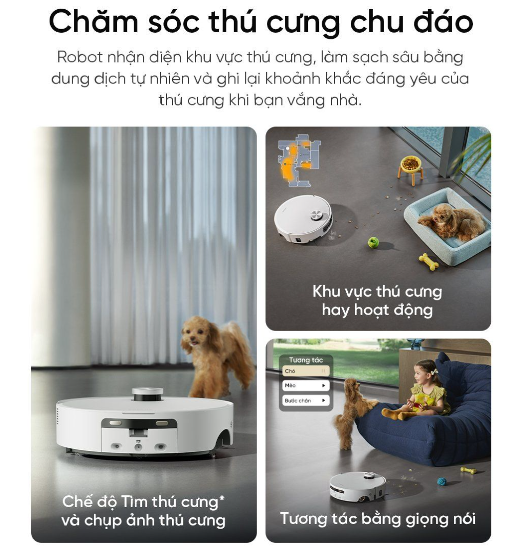 - Tùy chỉnh khu vực thú cưng: Robot tự động nhận diện đồ dùng quanh thú cưng, sau đó tránh hoặc làm sạch khu vực lân cận.
