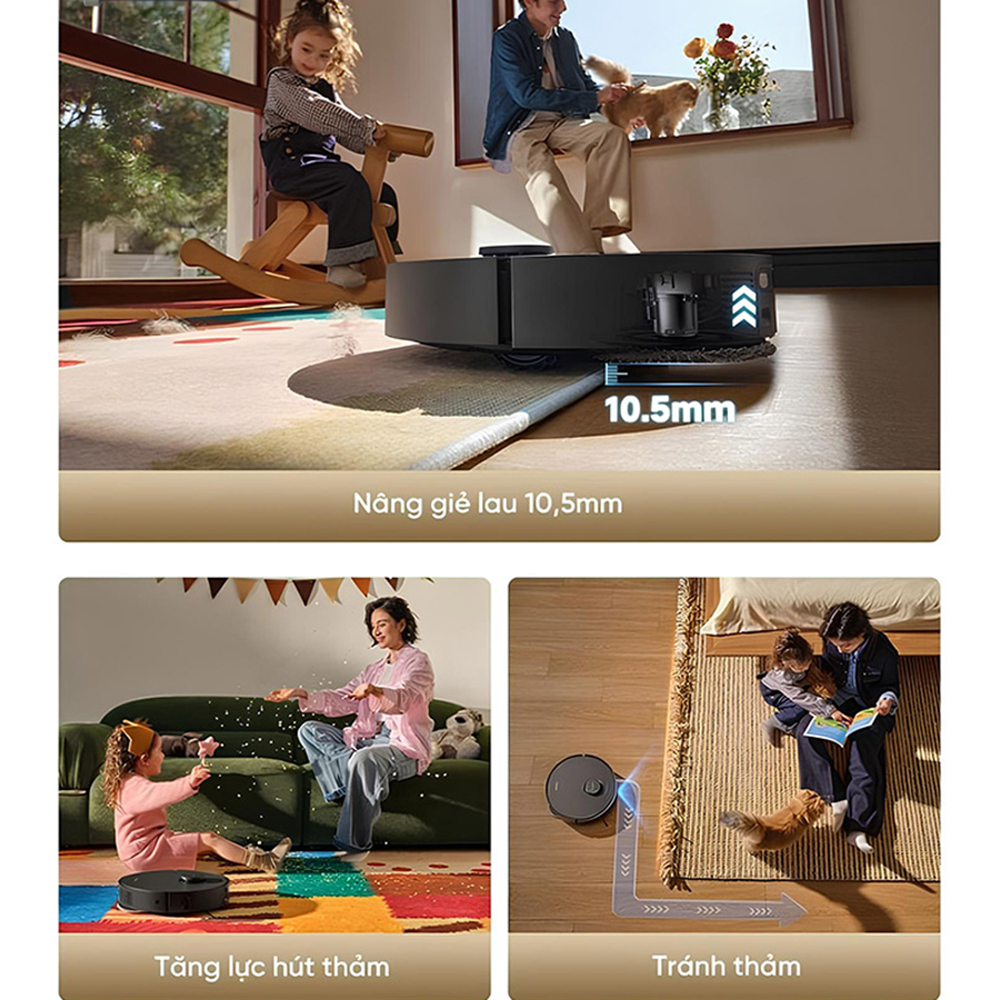 - Tránh thảm hoàn toàn: Tự động né tránh hoàn toàn khu vực thảm trong suốt chu trình di chuyển