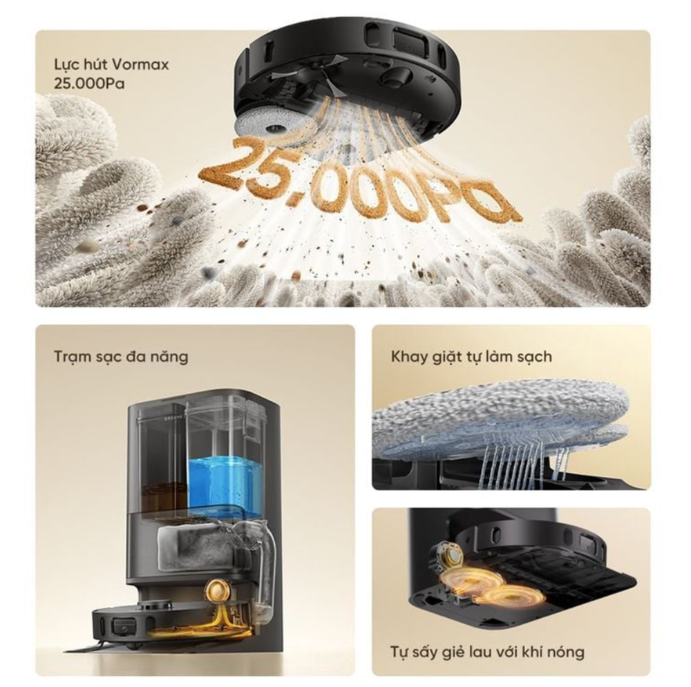 - Lực hút Vormax mạnh mẽ 25.000Pa: Đảm bảo thu gom triệt để các loại bụi bẩn trên nhiều bề mặt