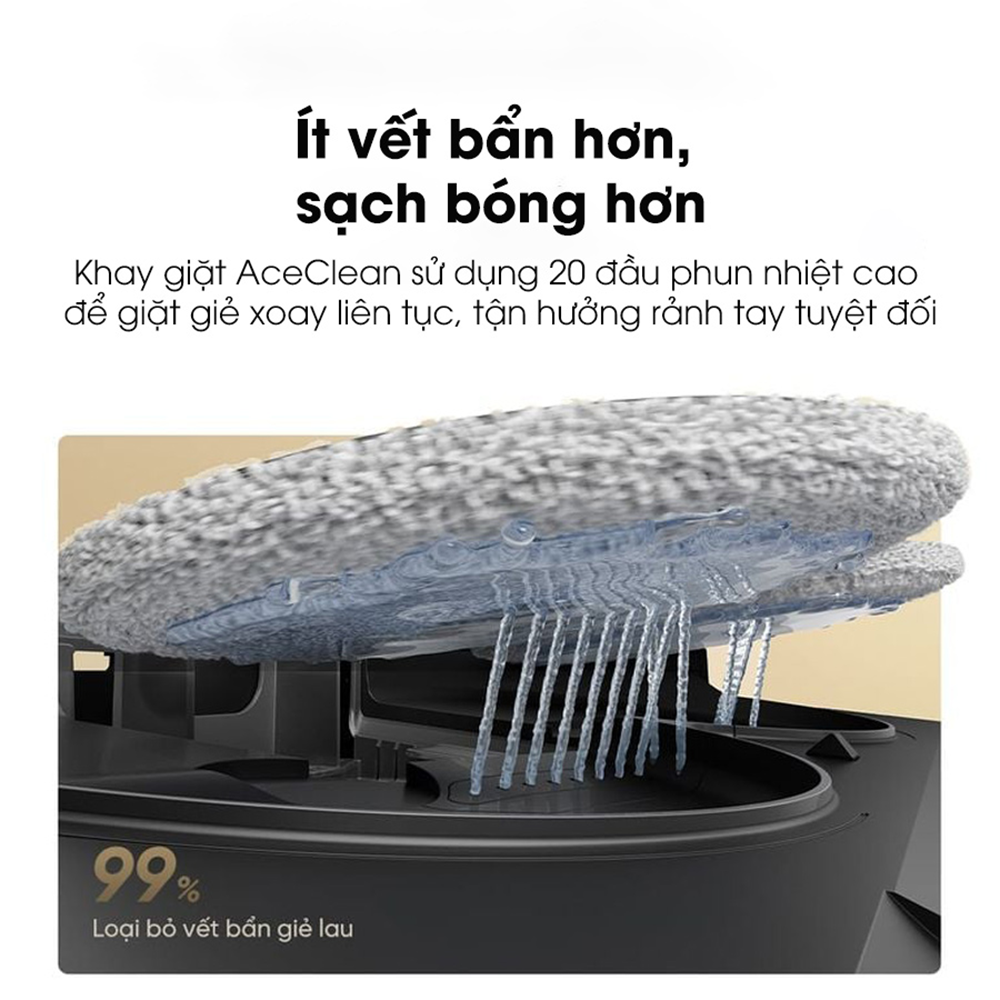 Điểm nhấn của trạm sạc là khay giặt tự làm sạch AceClean thế hệ mới (phiên bản 3.5), sử dụng 20 đầu phun nước để chà rửa giẻ lau xoay tốc độ cao. Quy trình này giúp loại bỏ đến 99% vết bẩn trên giẻ lau và xả nước bẩn đi ngay lập tức để hạn chế cặn bẩn. Bộ lọc của khay có thể tháo rời linh hoạt, giúp vệ sinh nhanh chóng. Sau khi làm sạch, hệ thống sấy khí nóng 50℃ sẽ làm khô giẻ nhanh chóng, ngăn chặn hiệu quả mùi hôi hay ẩm mốc.